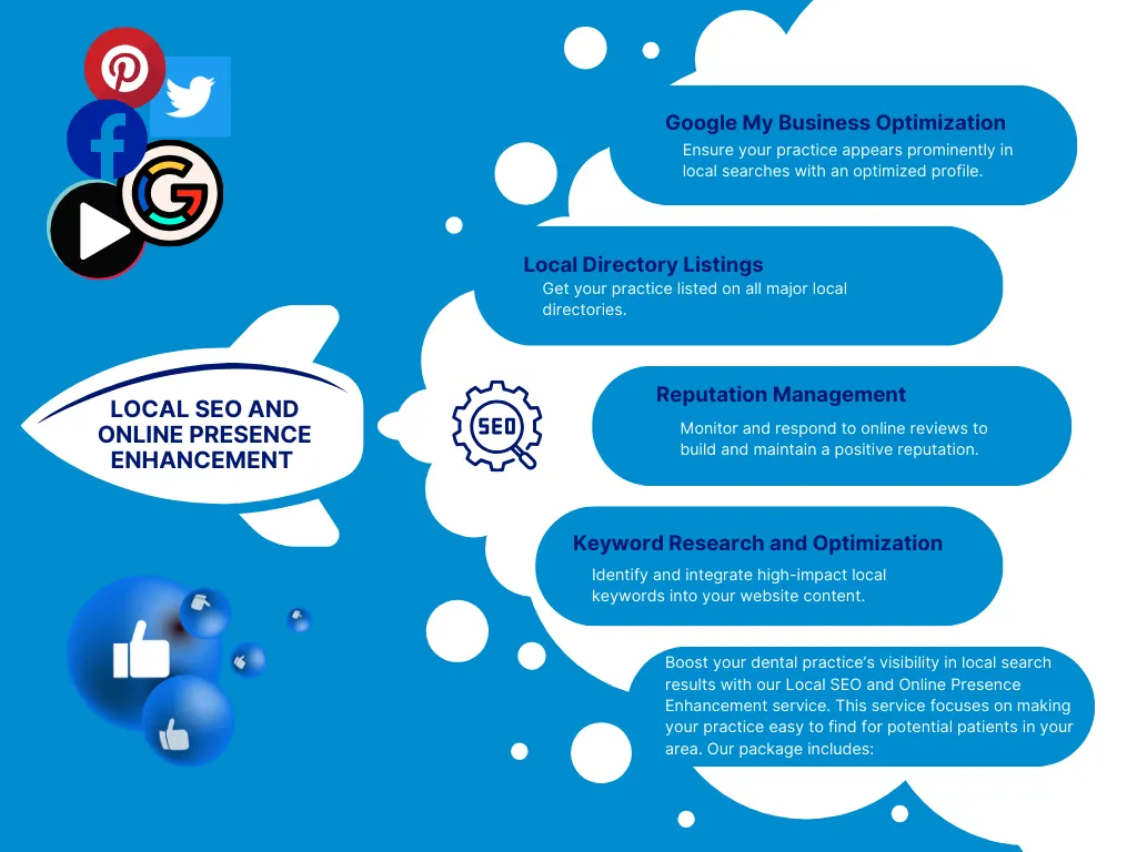 Boost your dental practice’s visibility in local search results with our Local SEO and Online Presence Enhancement service. This service focuses on making your practice easy to find for potential patients in your area. Our package includes:
